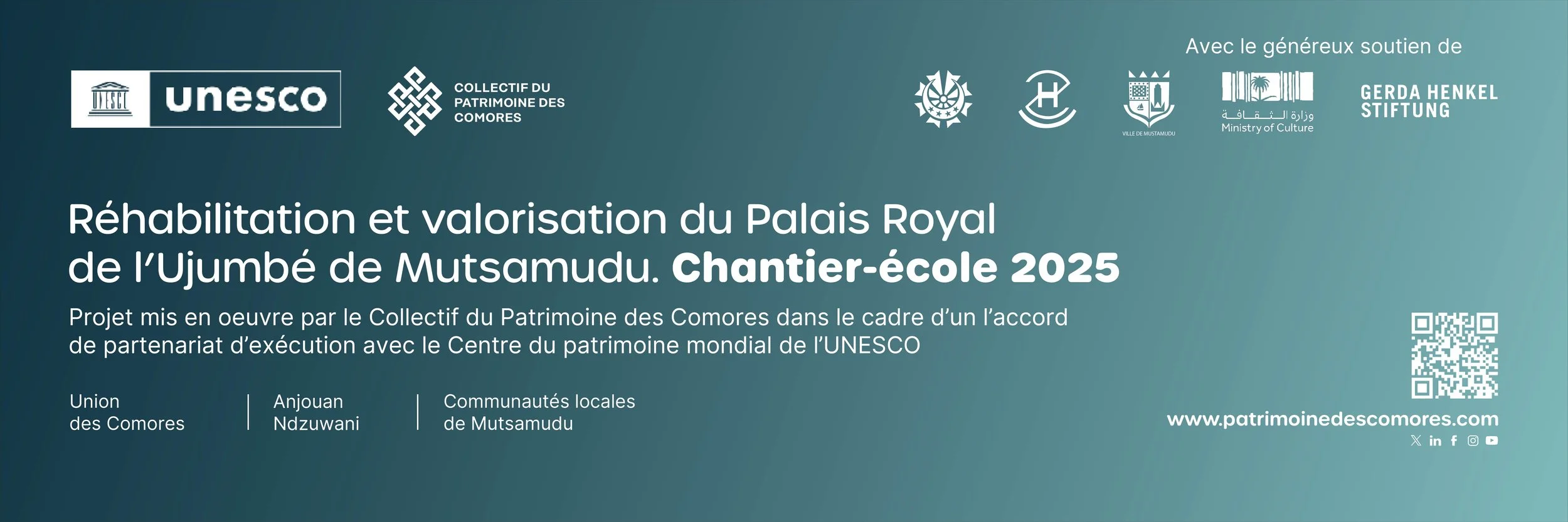 Le 28 juillet 2025, le Collectif du Patrimoine des Comores (CPC) a eu l’honneur de lancer officiellement le projet “Réhabilitation et valorisation du Palais Royal de l’Ujumbé » sous le haut patronage du Gouverneur d’Anjouan et du Maire de Mutsamudu. Cet événement lance officiellement les activités de l’accord de partenariat d’exécution signé entre le Collectif du Patrimoine des Comores et l’UNESCO qui reçoit le généreux soutien du ministère de la Culture du Royaume d’Arabie Saoudite.